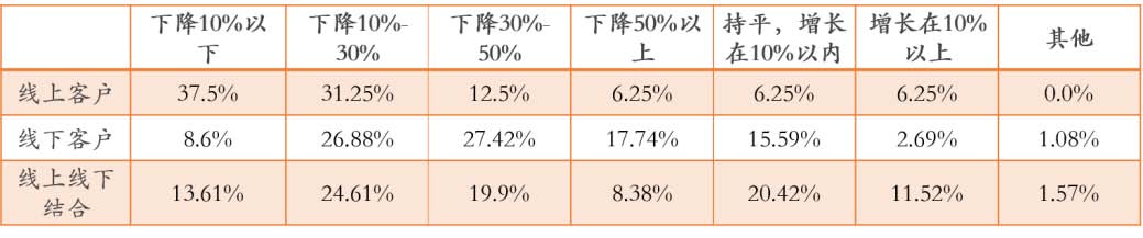 ? ? ??疫情對于以線上或線下客戶作為服務(wù)對象的文化企業(yè)來說,差異明顯。以服務(wù)線上用戶為主的文化企業(yè)認(rèn)為明年業(yè)績下降百分之十以內(nèi)的占到37.5,下降10%-30%的占比31.25%,下降30%-50%的占12.5%,而認(rèn)為業(yè)績持平或增長的文化企業(yè)都占到6.25%;而以服務(wù)線下客戶為主的文化企業(yè)認(rèn)為業(yè)績下降10%-30%的占26.88%,下降30%-50%的占27.42%,下降50%以上的占17.74%;線下線下結(jié)合服務(wù)客戶的文化企業(yè)相對來說受影響也比純服務(wù)線下客戶的文化企業(yè)較小,持平或增長的文化企業(yè)占比超過30%,下降10%以下的文化企業(yè)占13.61%,下降10%-30%的文化企業(yè)占比為24.61%,下降30%-50%的文化企業(yè)占比為19.9%。