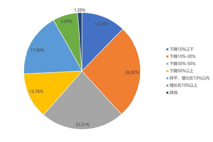 ? ? ??約74%的文化企業(yè)預(yù)測今年的經(jīng)營業(yè)績同比呈下降趨勢,其中認(rèn)為下降將超過10%以上的超過百分之六十(其中有12.76%文化企業(yè)認(rèn)為業(yè)績下降將超過50%),另外有17.6%文化企業(yè)可以持平,6.89%文化企業(yè)認(rèn)為增長在10%以上。總的來看,影響面大,產(chǎn)生了一定程度的悲觀心態(tài)。