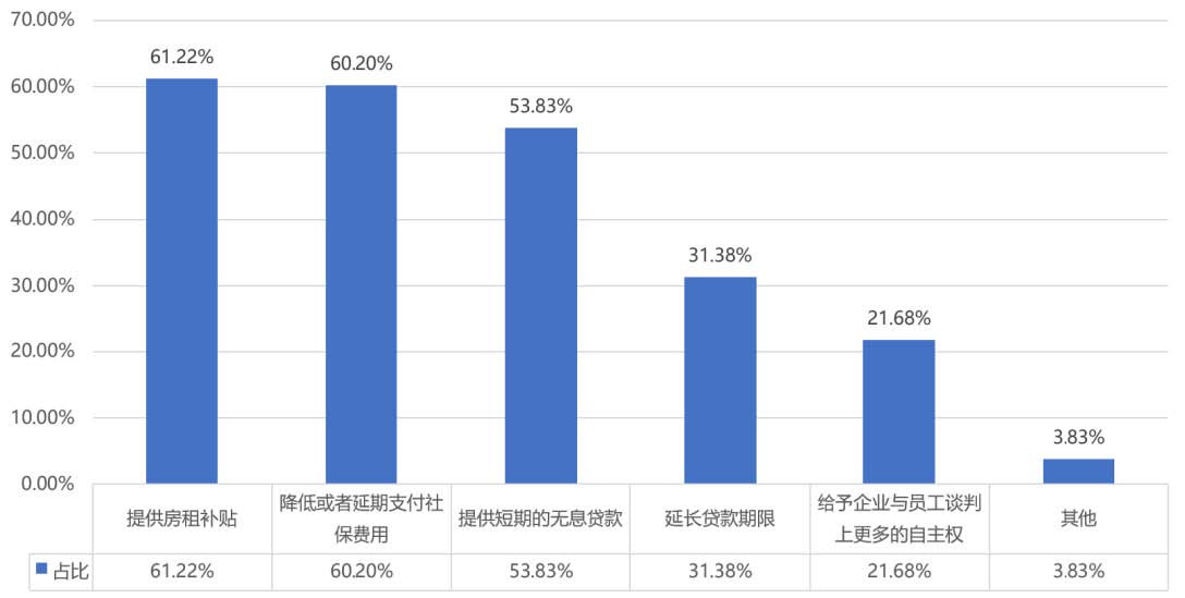 ? ? ??有61.22%文化企業(yè)希望提供租房補(bǔ)貼,有60.20%文化企業(yè)希望降低或者延期支付社保費(fèi)用,有53.38%文化企業(yè)希望提供短期的無息貸款,有31.38%文化企業(yè)希望延緩貸款期限,有21.68%文化企業(yè)希望給予與員工談判上更多的自主權(quán)。各類文化企業(yè)為當(dāng)前我國經(jīng)濟(jì)發(fā)展的主體,政府和社會能從多大程度上給予幫助渡過難關(guān),將顯得至關(guān)重要。