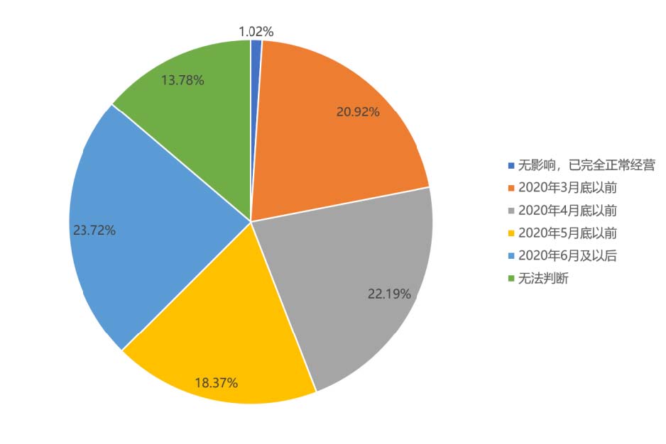 ? ? ??約79%的文化企業(yè)認(rèn)為2020年3月底以前文化企業(yè)都不能恢復(fù)到正常營業(yè)狀態(tài);大約60%的文化企業(yè)認(rèn)為在6月份之前可以正常恢復(fù)生產(chǎn)經(jīng)營;23.72%的文化企業(yè)認(rèn)為要在6月以后才能恢復(fù)。對于大多數(shù)文化企業(yè)來說,由于有幾個月時(shí)間不能正常營業(yè),2020年將會是非常艱難的一年。