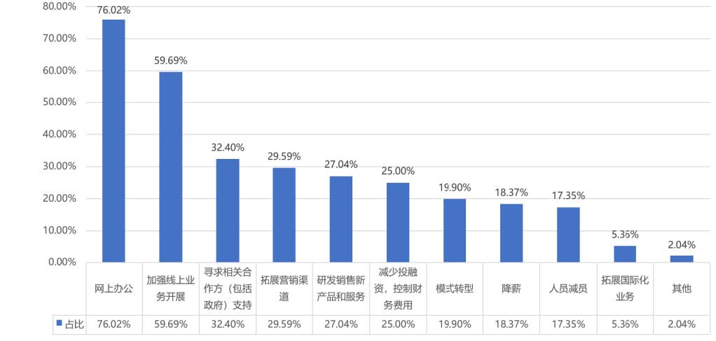 ? ? ??76.02%文化企業(yè)采取線上辦公,59.69%加強(qiáng)線上業(yè)務(wù)拓展的方式。外部環(huán)境的變化,帶來了組織行為的轉(zhuǎn)變,既是挑戰(zhàn),也是文化企業(yè)迎難而上強(qiáng)化線上業(yè)務(wù)的機(jī)遇。在巨大壓力下,文化企業(yè)各顯神通,32.40%文化企業(yè)尋求相關(guān)合作方支持,29.59%文化企業(yè)拓展?fàn)I銷渠道,27.04%文化企業(yè)采用研發(fā)銷售新產(chǎn)品和服務(wù),25%文化企業(yè)減少投融資控制財(cái)務(wù)費(fèi)用,19.9%文化企業(yè)選擇模式轉(zhuǎn)型,還有18.37%的文化企業(yè)選擇了降薪,17.35%的文化企業(yè)被迫減員。