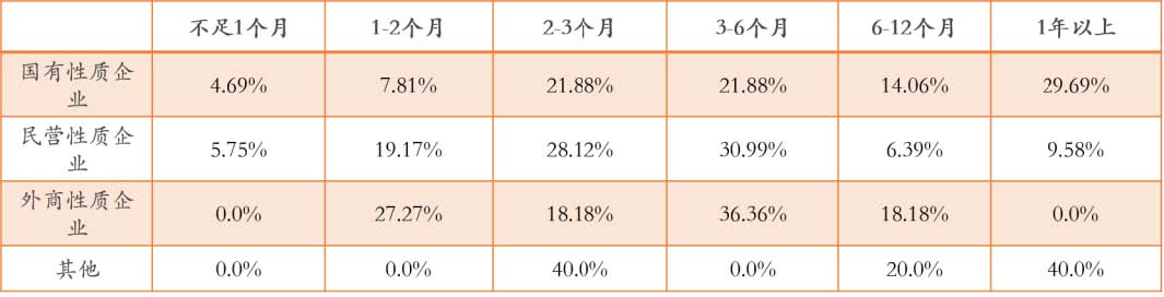 ? ? ??對于超過90%以上的國有文化企業(yè)說來資金維持時(shí)間超過2個月,且能維持一年以上的占比,與達(dá)到29.69%。相對來說,民營性質(zhì)文化企業(yè)及外商性質(zhì)文化企業(yè)面臨資金壓力較大,有近85%民營性質(zhì)文化企業(yè)和近80%外商性質(zhì)文化企業(yè)資金預(yù)計(jì)支撐不到半年。